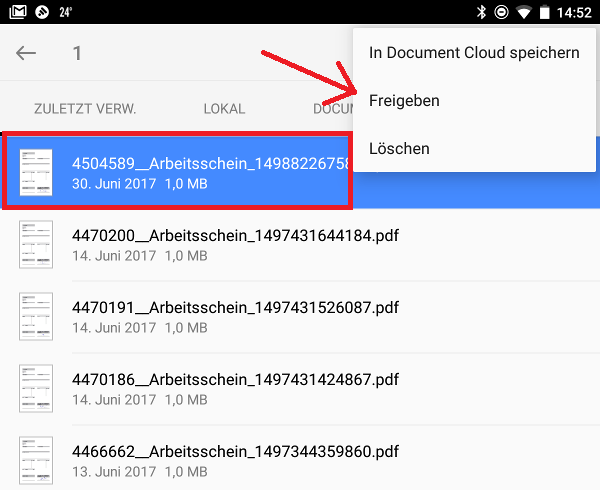 Öffnen Sie dazu die Adobe PDF Reader App und gehen suchen Sie den entsprechenden Arbeitsschein heraus. Falls Sie den letzten (oder einen anderen, aktuellen) Arbeitsschein teilen wollen, finden Sie diesen am schnellsten unter dem Punkt "Zuletzt Verw." (Zuletzt verwendet).