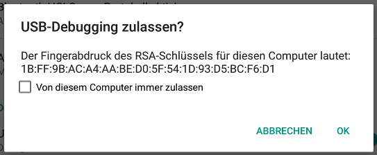 Verbinden Sie nun das Tablet über das USB-Kabel mit Ihrem PC. Auf Ihrem Tablet/Telefon erscheint nun die Meldung "USB-Debugging zulassen?". Diese bestätigen Sie mit "OK".
