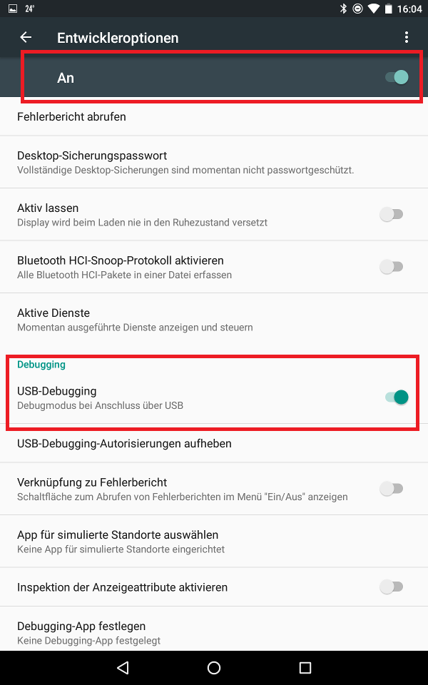 Aktivieren Sie auf ihrem Android-Gerät den Entwicklermodus. Dazu klicken Sie unter "Einstellungen" -> "Über das Tablet" 7x auf "Build-Nummer" (meistens die letzte Option ganz unten)
